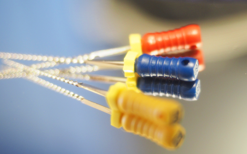 根管治療は、トンネル状の穴(根管)の細菌に汚染された内面を専用の器具で削り取りながら清掃・拡大します。また、歯の根っこが1本の前歯と、根が1〜4本ある奥歯とでは処置時間が異なります。特に複数根ある奥歯で根が歪んでいたり、髪の毛のように細い根管の場合、1回の治療にかなりの時間がかかり、数回にわたることもあります。