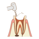 こうなると神経は救えないため、麻酔をした上で神経を取る処置(抜髄/ばつずい)を行うことになります。ただし、神経を取って痛みが一時的に落ち着いたとしても、炎症が自然に治ることはほとんどありません。放置すると、炎症が歯の根の先まで広がり、膿がたまって歯ぐきが腫れたり、噛んだ時の痛みが続くことがあります。そのため、神経を取ったら、そのまま歯の根っこの治療に移ります。