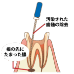 根管治療は、歯の根の治療のことで、歯の神経(歯髄/しずい)が炎症を起こしたり、細菌に感染してしまったときに行う神経の治療です。